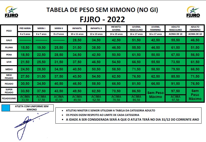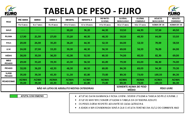 • Buscando atribuir equilíbrio na participação de todos os atletas e também ter excelência na organização, cronograma entre outros, a FJJRO decide limitar a quantidade de participação dos atletas de até 14 anos de idade, no importe de 50% da capacidade máxima;